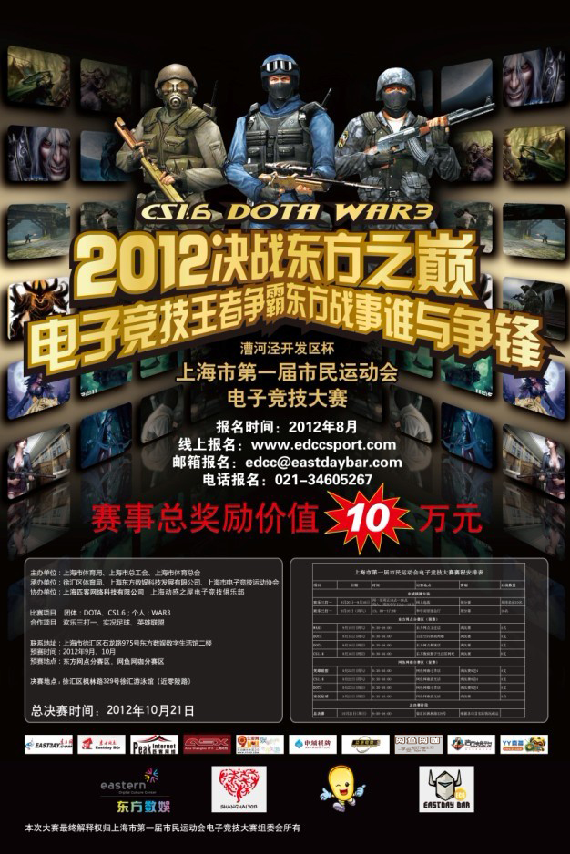 “漕河泾杯”上海市第一届市民运动会—电子竞技大赛各项目的决赛(War3、CS1.6、DOTA、实况足球、SD敢达、欢乐三打一、英雄联盟),将于2012年10月21日,徐汇游泳馆举行,地址:徐汇区枫林路329号(靠近零陵路)。望各位进入决赛的选手注意:决赛的时间、地点。同时,也欢迎各位电子竞技爱好者届时前来观摩,为决赛的选手加油、助威!