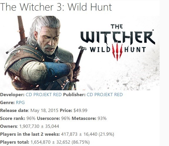 《巫师3》仅在Steam平台就有非常好的销量