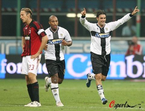 第66分钟AC米兰走马换将,今夏加盟的巴西后腰埃默森替下了布罗基;第72分钟卡卡将球分到右肋部,扬库罗夫斯基高速插上套边传中,奥多后点凌空打门偏出目标;1分钟后帕尔玛扳平了比分,当时科拉迪头球摆渡,雷吉纳尔多盘球到左边路后杂耍般晃过奥多,巴西前锋看准时机传中,皮萨努前门柱抢点攻门,迪达猝不及防,皮球应声入网,1-1!